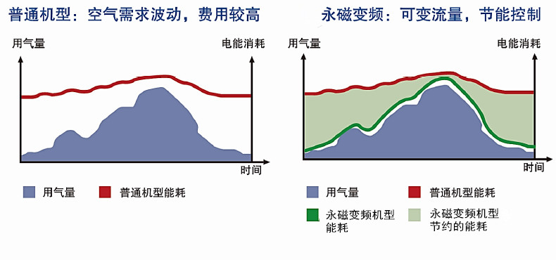 空壓機(jī)能耗費(fèi)用一般要占到使用周期整體費(fèi)用的82%左右,空壓機(jī)的電費(fèi)可能高達(dá)工廠全部電費(fèi)的40%以上。長(zhǎng)期的跟蹤證明,大部分用戶的壓縮空氣需求在不同日期,不同時(shí)間或不同月份都有40%-80%的大幅波動(dòng)。
